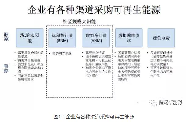 企业采购可再生能源的最主要方式是通过虚拟购电协议(VPPAs),即签订可再生能源项目合约,这部分电力将在电力批发市场上交易。企业也可以选择安装现场太阳能发电系统,一般由电力公司以净计量方式计费,允许企业将多余电量出售给电网。第三种方式是通过电力公司绿色电费计划购买可再生能源电力,如Switch公司在2015年7月与内华达能源公司所协商的那样。选择不同方式对应不同的项目规模、价格以及风险结构。有些企业(如谷歌和苹果)会根据各自的业务需求和可持续发展目标选择不同合同结构、规模和项目所在地的组合。