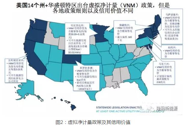 企业买家需要综合评估州政策、信用抵扣结构以及可再生能源信用配置来决定社区规模太阳能是否有助于实现自身目标。有必要将场外太阳能项目发电量以某种形式的虚拟经计量方式记入用户的电费账单。目前,全美共有14个州和哥伦比亚特区都已出台某种形式的虚拟净计量政策(如图2),但各地的账单抵扣标准差别巨大。纽约公共服务委员会规定净计量抵扣额根据社区太阳能项目签约电量度数进行累计,而加利福尼亚州公共事业委员会则规定净计量抵扣额计算方法为发电电价减去0.02-0.03美元的电力公司收费。很显然,净计量电费的抵扣标准极大地影响着社区规模太阳能成为所在企业或社区潜在用电来源的经济性和吸引力。