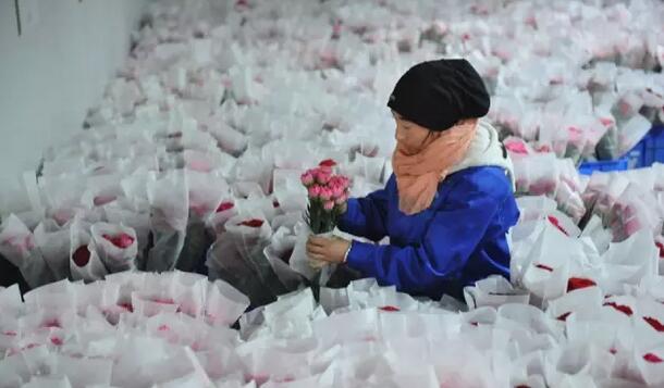 在光伏农业产业园,有个鲜花进出口基地。进入其中一个工作车间,,地上铺满了新鲜的康乃馨,10多名工人正在忙着给康乃馨剪枝、包扎。“这些都是发往迪拜的,共有6000扎。”班组长马玉霞说。