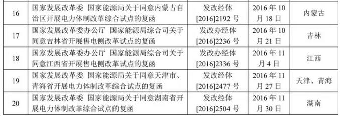 表:各省(区、市)电力改方案获批文件(截止2016年12月31日)