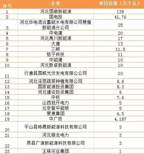 从项目容量来看,河北国顺新能源以1380MW的规模绝对领先;国电投以417.6MW的规模位居第二;河北华电混合蓄能水电有限公司赞皇新能源分公司以250MW的规模位居第三。