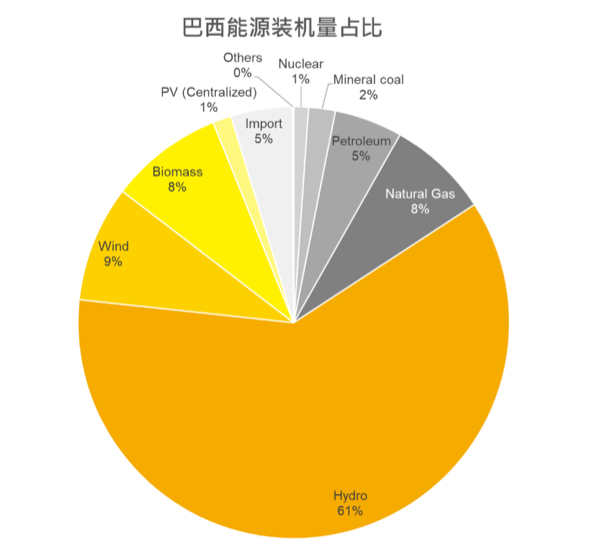 巴西的能源供应多半由再生能源所贡献,其中水力的发展最为成熟,主宰全国超过一半的用电需求,而在装机的数量上也是所有能源项目之最,占比高达61%。而光伏在当地的装机量占比仍占约莫1%,但考虑到近年光伏的降本速度提升,加上政府的发展目标也开始从水力转移到风力及光伏上面,因此预估未来光伏的装机量占比会持续提升,也将连带帮助巴西再生能源发电量有所增长。