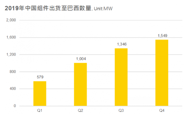 2019年自中国出货至巴西的组件数量达到4.4GW,和实际的装机量相比有庞大的落差,这些剩余的组件估计多半是将被第四轮竞标项目、无补贴项目、电力公司私人PPA项目以及需求正旺的分布式项目所用。