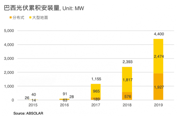 整体而言,巴西的光伏市场已从2012年的萌芽期进展到现在增长迅猛的阶段,截至2019年年底,巴西的光伏累积安装量已达到4.4GW,其中分布式项目的累积安装量已达到1.9GW,大型地面项目则约为2.5GW。