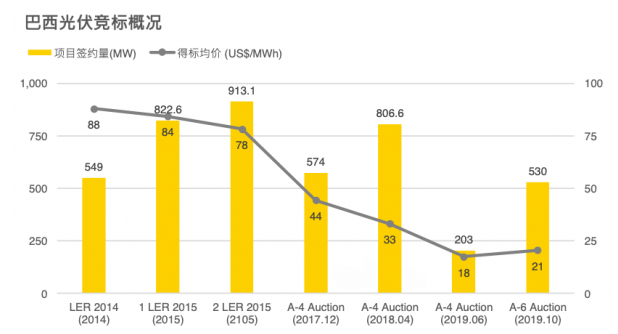 近年归功于光伏技术的快速进步也连带带动起当地分布式系统的降本速度提升,在搭配既有的政策下,使得分布式的需求有突飞猛进的成长,另一个策动光伏发展的政策为竞价,2014年政府出台首轮的大型竞价,让巴西的大型项目有了突破性的进展,截至2014-2019年间巴西共完成了7轮的光伏招标,共开出约莫4.4GW的标案量,其中第四轮的约莫580MW的标案项目可能会在今年度完工并网。