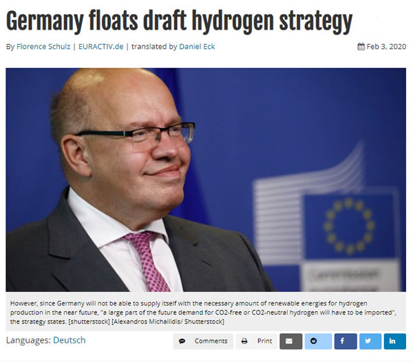 德国经济部长彼得·阿尔特迈尔(Peter Altmaier)主导制定的国家氢战略草案已经送交德国多个部委征求意见,力争到2030年德国至少20%的氢将由可再生能源生产,即所谓的绿色氢。