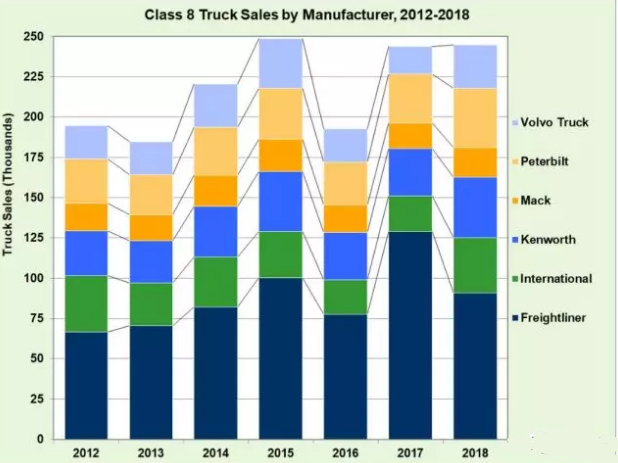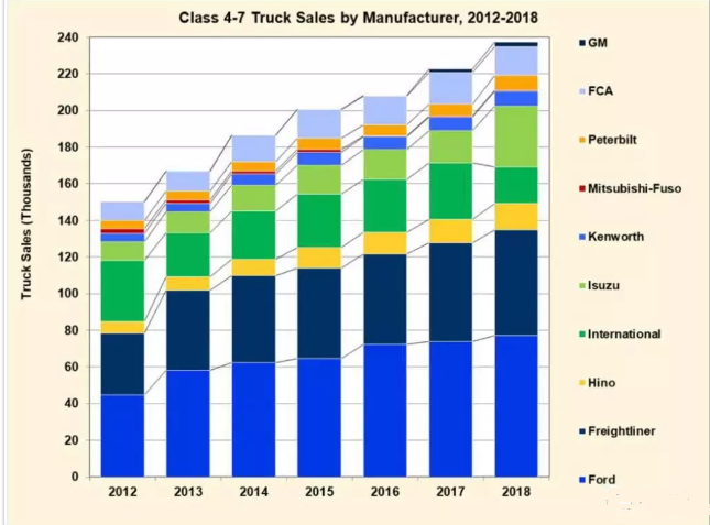 美国国内8级卡车的市场很大,而且仍在增长。如下述图1及图2所示,8级卡车年销售量约250,000辆(2015年、2017年和2018年),销量持续增长的4-7级卡车也于2018年达到240,000辆<1>。6卡车的长距离应用场景非常重要:40%的卡车日均行驶250-750英里(每年行驶261天),占长途卡车行驶里程的70%。(参考“车辆清单和使用情况调查”7 [VIUS]<2>年行驶里程,请参阅下述车辆行驶范围假设)。