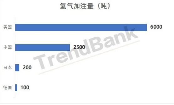 在氢气加注方面,TrendBank数据显示,美国氢能领域氢气加注量位居全球第一,为6000吨;紧随其二的是中国,氢加注量2500吨;其次是日本,最后是德国。