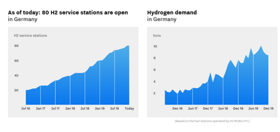 H2 Mobility网上展示了德国加氢站数量变化及氢气需求的变化,2016年氢气需求量为2吨/月,随着加氢站数量的增多,氢气需求量也在同步,截至2020年1月,德国加氢站运营数量是81座,氢气需求量在8吨/月,最高时可以达到10吨/月,全年累计氢加注量在100吨左右。