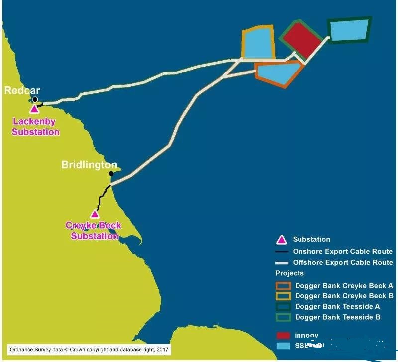 Dogger Bank位于英国北海,离岸距离130至200公里,水深范围18米到63米。项目总投资约100亿英镑,SSE Renewables主要负责建设,而Equinor主要负责运维。项目由Creyke Beck A 、Creyke Beck B和Teesside A三座子风场构成,分三期建设,每期容量1.2GW,总装机3.6GW,预计首台风机于2023年发电,2025年全部风机投运。在2019年10月公布的英国第三轮CfD竞标中,三期项目全部胜出,电价分别为39.65英镑/兆瓦时、41.611英镑/兆瓦时、41.611英镑/兆瓦时。