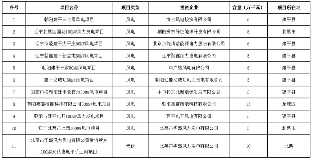 6月30日,朝阳市人民政府网发布“关于朝阳市风电、光伏项目竞争配置结果的公示”,其中风电项目10个,总容量为60万千瓦,光伏项目为1个,容量为10万千瓦。