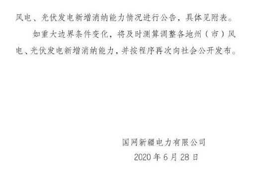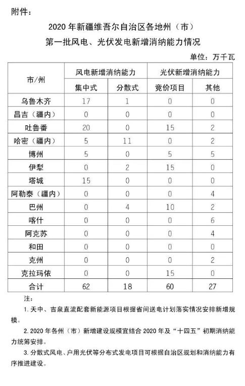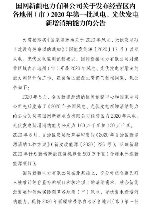 国网新疆电力有限公司消息:日前,国网新疆发布关于经营区内各地州(市)2020年第一批风电、光伏发电新增消纳能力的公告,光伏新增消纳能力87万千瓦,其中竞价项目60万千瓦,其他项目27万千瓦。