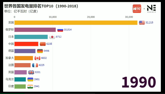 以1992年为例,当年中国发电量仅为7540亿千瓦时,位列世界第四,仅为美国30750亿千瓦时的四分之一。