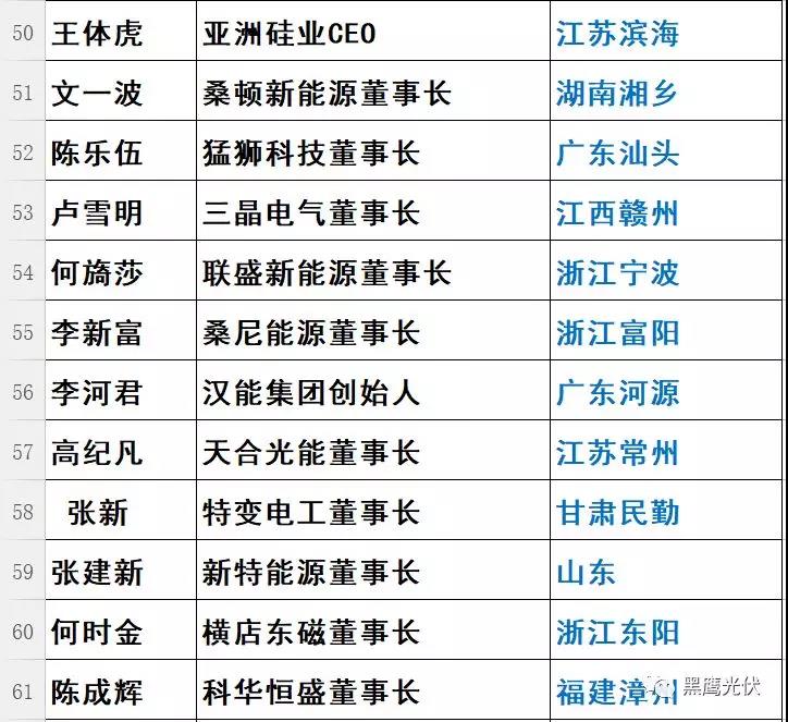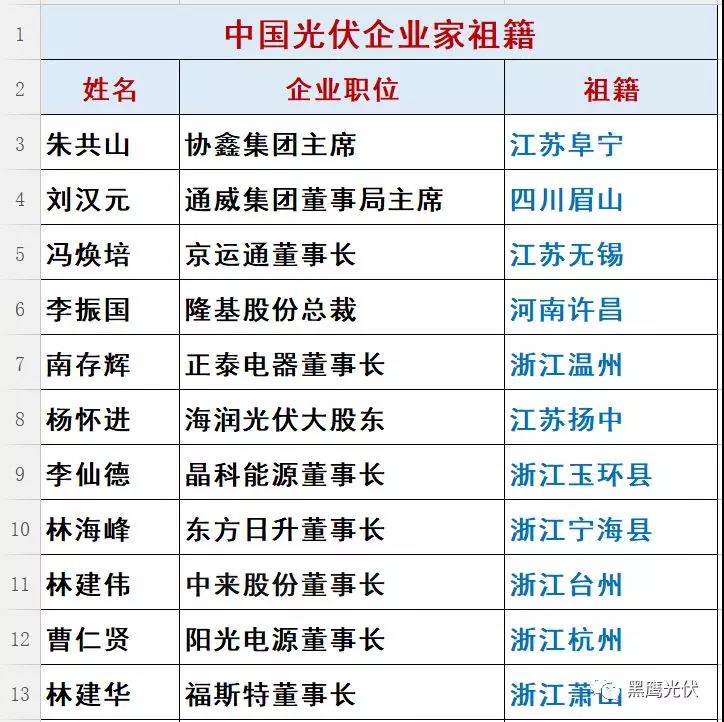 比如,中利科技集团董事长王柏兴的原籍为江苏省常熟市沙家浜镇。协鑫集团董事长朱共山原籍为江苏省阜宁县东沟镇。光伏玻璃巨头福莱特的创始人阮洪良,祖籍浙江嘉兴。甚至逆变器龙头企业阳光电源创始人曹仁贤出生地也是浙江。