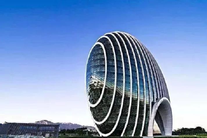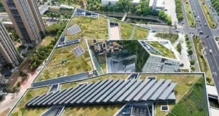 中国武进凤凰谷文化中心这座建筑物除了绿色的屋顶之外,该建筑的外墙还被内置的太阳能光伏板(光伏建筑一体化系统)、太阳能电池板、宽大的LED屏幕与LED灯包围着。