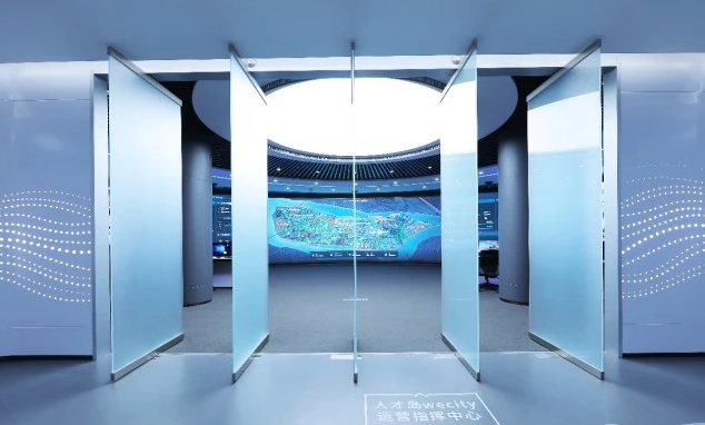 “智慧之门”旋转开启,展厅“心脏”位置的人才岛WeCity运营指挥中心显现眼前。中央包围式的可视化大屏,在环形空间内实时更新人才岛智慧城市建设数据,探索以人为核心的智慧城市新模式。