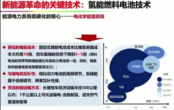 另外一个就是氢能燃料电池技术,应该也取得了一定程度的突破。根据储能装置的特性,目前的基本共识是:动力电池是分布式、短周期储能的最佳选择;而长周期、大规模储能要靠氢能;在车下固定式储能,氢能的成本比电池储电要低一个数量级(当然车上不是这样,车上没地方放,只好高压,成本就上去了),而且可以大规模、长周期储能。另外储氢和储电互补。第三,运储方式也比较灵活,例如不一定要在新疆集中式可再生能源基地制氢,也可以在北京,对稳定电网无论哪里都一样。总之,氢是集中式可再生能源大规模、长周期储存的最佳途径,一旦可再生能源成本降低,如果到0.1元一度电,储存成本在总成本中间占的比例就最大,那时候它的优势就出来了,这是它存在的合理性。