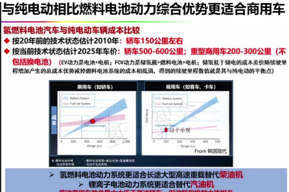所以基于可再生能源,纯电动和氢燃料电池优势凸显。再看氢燃料电池和纯电动车辆成本比较:20年前刚开始搞电动汽车专项时,按照当时的技术状态,估计2010年纯电动轿车只能跑150公里,150公里以上燃料电池就有优势。但是按照现在的状态估计2025年车价,纯电动轿车500-600公里内都有成本优势。但是重型商用车,氢燃料电池300以上就有优势(这里不考虑换电重卡)。