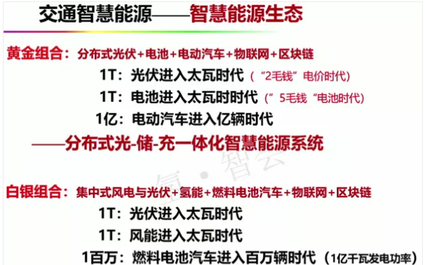 未来智慧能源生态将有两个组合:一个是黄金组合——分布式光伏+电池+电动汽车+物联网+区块链;光伏进入2毛钱电价,电池将会进入5毛钱一瓦时的时代,电动汽车进入了亿辆时代;还有一个是白银组合,就是集中式风电与光伏+氢能+燃料电池汽车+物联网+区块链。