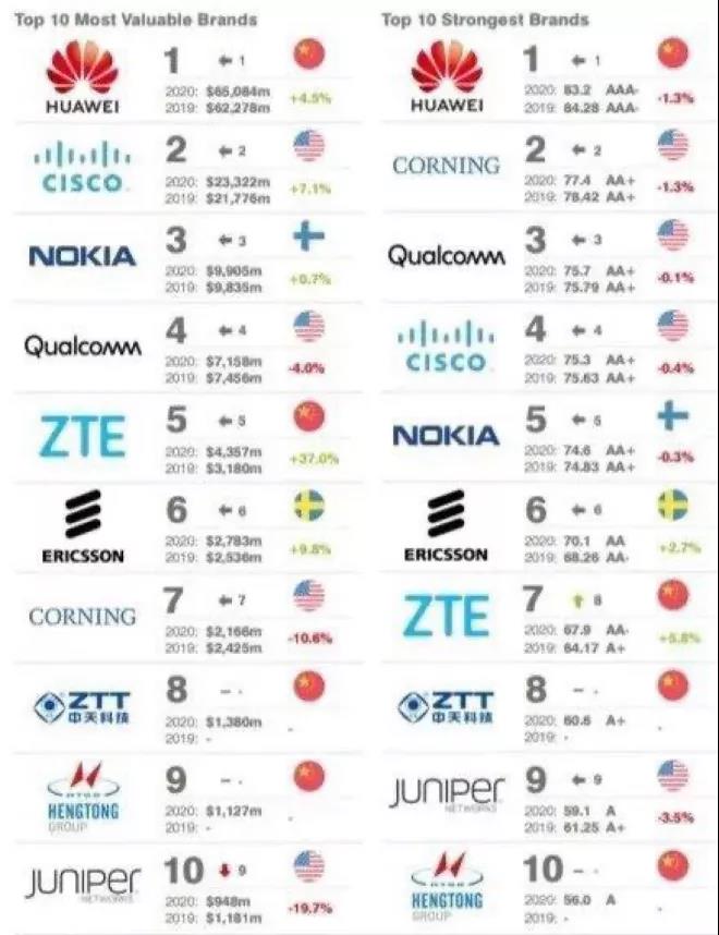 此外,中兴是增长幅度最高的通信设备厂商,较2018年,中兴品牌价值增长了37%,可见在挺过2018年的中兴事件之后,中兴的表现也得到了权威机构的认可。