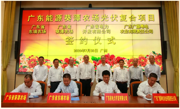 签约仪式上,广东能源集团所属开发公司与广东农垦集团所属广东省葵潭农场、广东省东埔农场及广东广垦粤电农业有限责任公司还签订了广东能源葵潭农场光伏复合项目合作合同,共同推进葵潭农场500MW光伏复合项目的建设,为促进农场产业转型、提高土地利用效率贡献力量,推动地方能源供应、节能减排、绿色环保以及改善投资环境等再上新台阶。