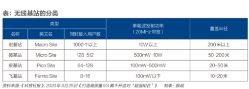 我们通常所说的4G或5G基站指的是宏基站。通过宏基站和微、皮、飞基站的组合可实现一个城区的全域覆盖。