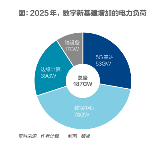 按照以上分析和粗略匡算,在不考虑能效大幅提升以及数据中心的结构性大调整的情况下,到2025年,数字基础设施的“新基建”起码需要187GW新增电力装机容量来支持,5G基站(53GW)、数据中心(78GW)和分布式边缘计算服务器(39GW)和端设备(17GW)是主要耗能大户。