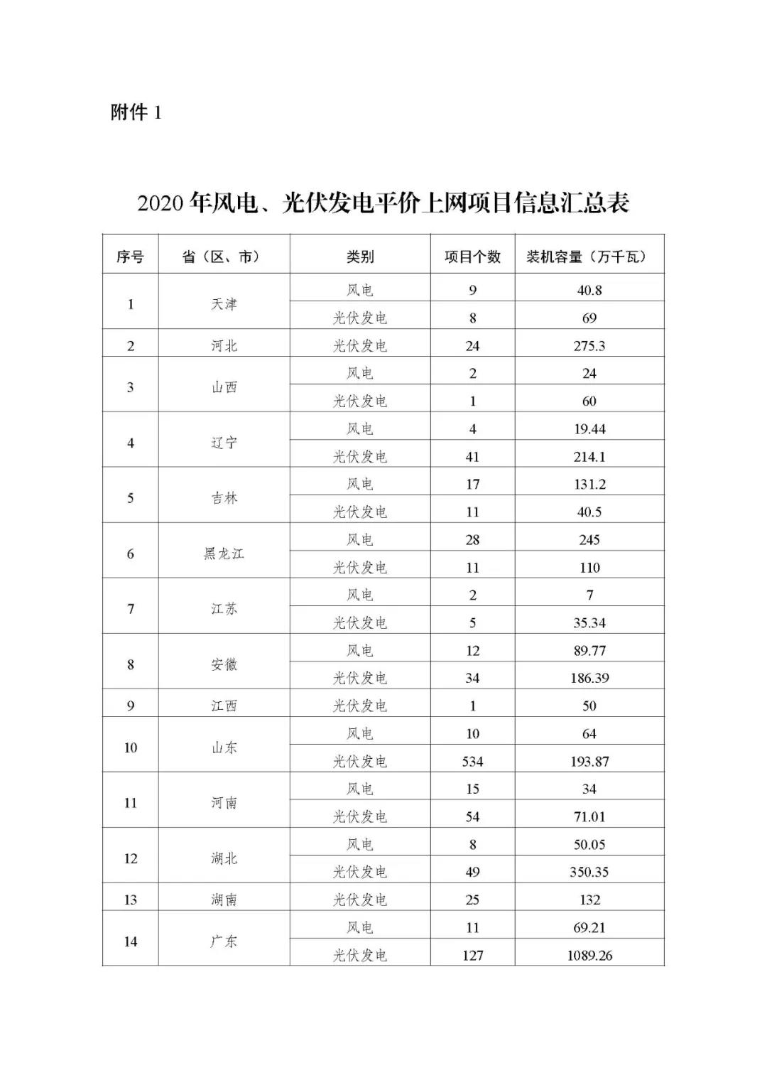 (一)公布2020年风电、光伏发电平价上网项目名单