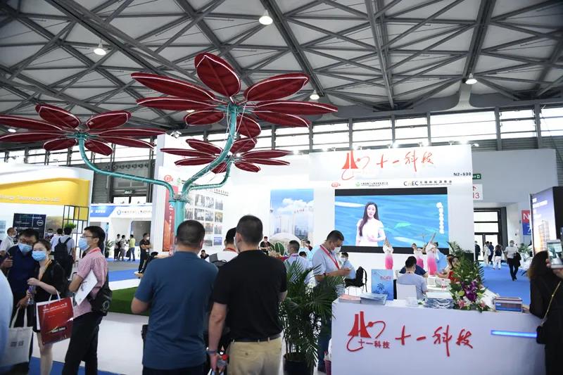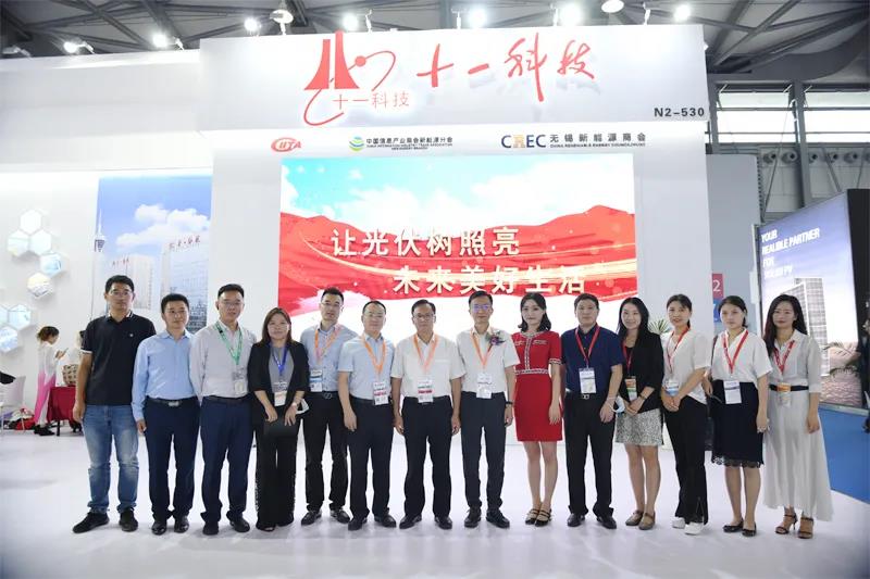 开幕式后,各位行业领袖嘉宾进行集体巡馆,一路上参观了协鑫集团、华为、隆基、中环、特变、阳光电源、十一科技等参展企业展台,了解各家企业的产品及技术,为企业与行业的发展探讨方向。各位行业领袖莅临十一科技展台后,王毅勃、余才志携十一科技干部热情接待,并与客人们亲切交流,合影留念。石定寰参事对十一科技的企业文化和光伏树产品的创新及发展给予了高度肯定。展会期间,十一科技展台上也是人头攒动,在美妙的歌声以及曼妙的舞姿衬托下,别具一格的光伏树更为我院展台增色不少。