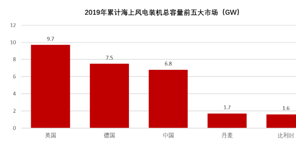 截止2019年底,欧洲的英国和德国累计海上风电装机容量最大,分别是9.7GW和7.5GW。中国、丹麦和比利时分别是6.8GW、1.7GW和1.6GW。
