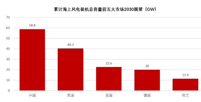 GWEC预测,到2030年,中国、英国、美国、德国和荷兰的海上风电装机容量将增加到58.8GW、40.3GW、22.6GW、20GW和11.4GW。其中中国的增长规模最大,未来10年将再增加超过50GW的海上风电装机容量。