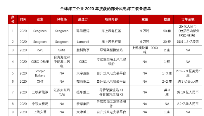 风电海工装备中最多的订单是风电安装平台和导管架或者桩基建造工程。当然,升压站项目也较多,上面表格没有完全列出升压站订单。