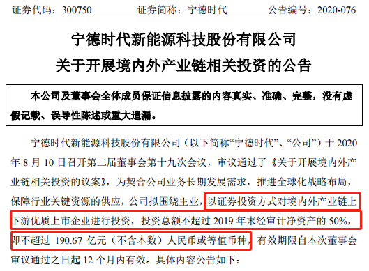 宁德时代称,公司拟围绕主业,以证券投资方式对境内外产业链上下游优质上市企业进行投资,投资总额不超过2019年末经审计净资产的50%,即不超过人民币190.67亿元,其中境外投资总额不超过25亿美元。有效期限自本次董事会审议通过之日起12个月内有效。
