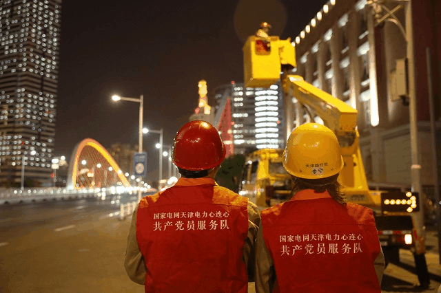 国网天津电力党员服务队巡检路灯设施,建设智慧路灯,点亮津城夜景