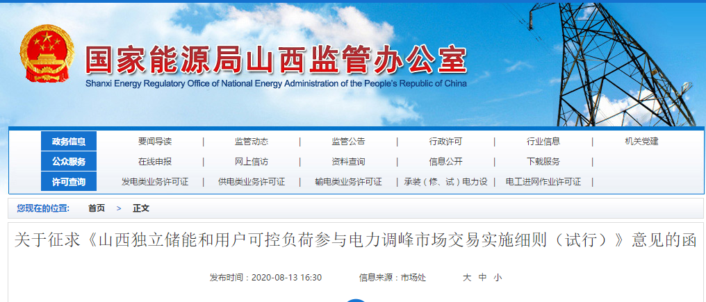 关于征求《山西独立储能和用户可控负荷参与电力调峰市场交易实施细则(试行)