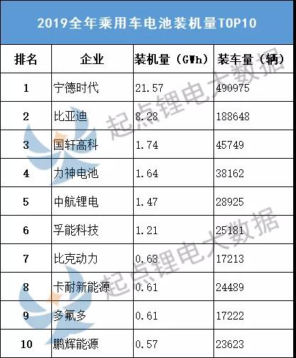 2019全年乘用车装机量TOP10的企业分别是宁德时代、比亚迪、国轩高科、力神电池、中航锂电、孚能科技、比克动力、卡耐新能源、多氟多、鹏辉能源,具体如下图所示: