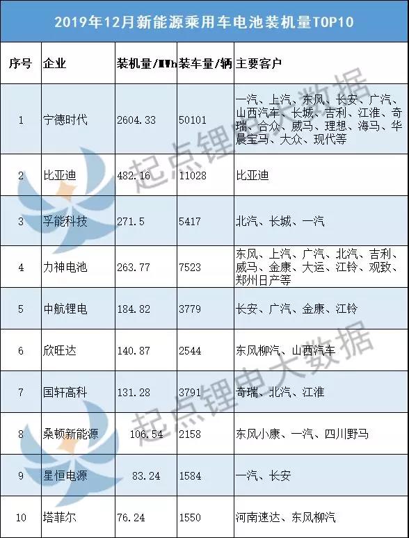 就具体乘用车装机量数据来看,12月份排名前15的企业分别宁德时代、比亚迪、孚能科技、力神电池、中航锂电、欣旺达、国轩高科、桑顿新能源、星恒电源、塔菲尔。