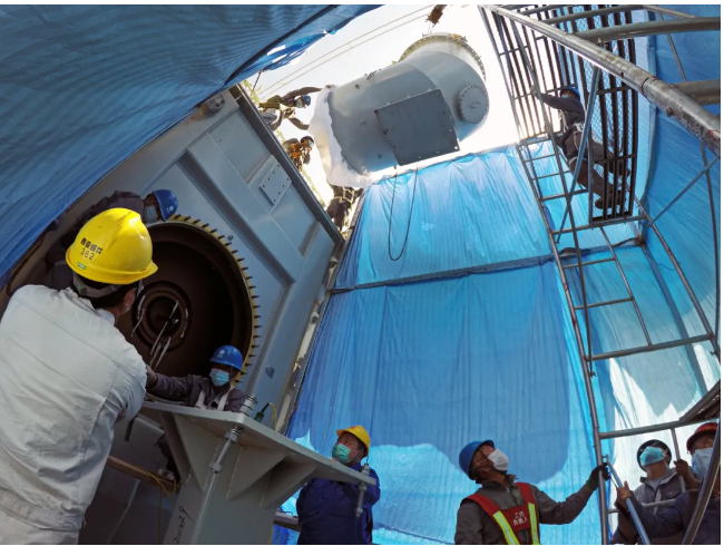▲5月29日,施工人员在张北1000千伏特高压变电站进行可控高抗升高座安装。