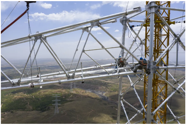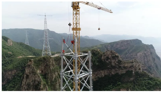 ▲张北-雄安1000千伏特高压交流输电线路工程(冀北段)最难施工塔位——3S069号塔组塔施工作业。王阳阳/摄