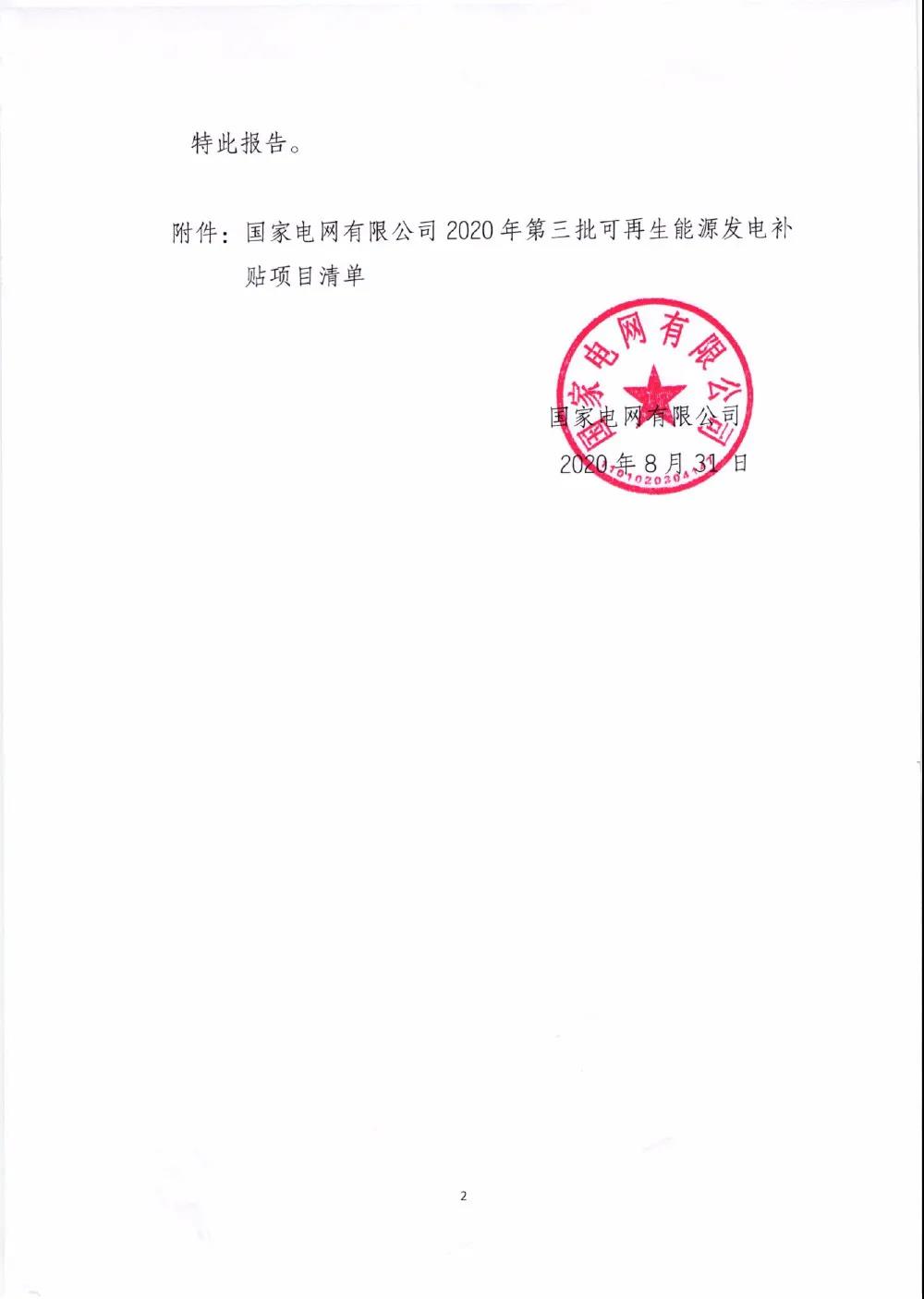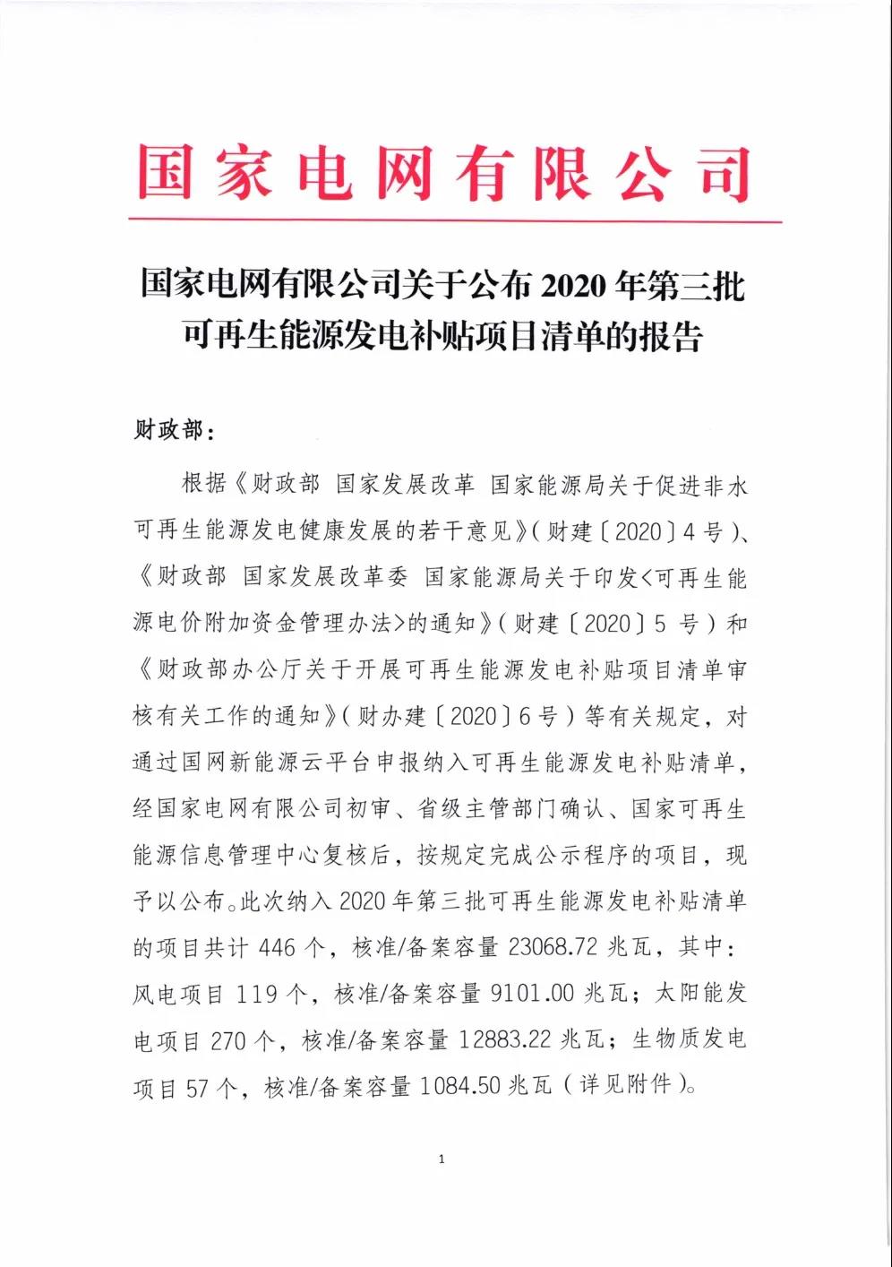 关于公布2020年第三批可再生能源发电补贴项目清单的公告