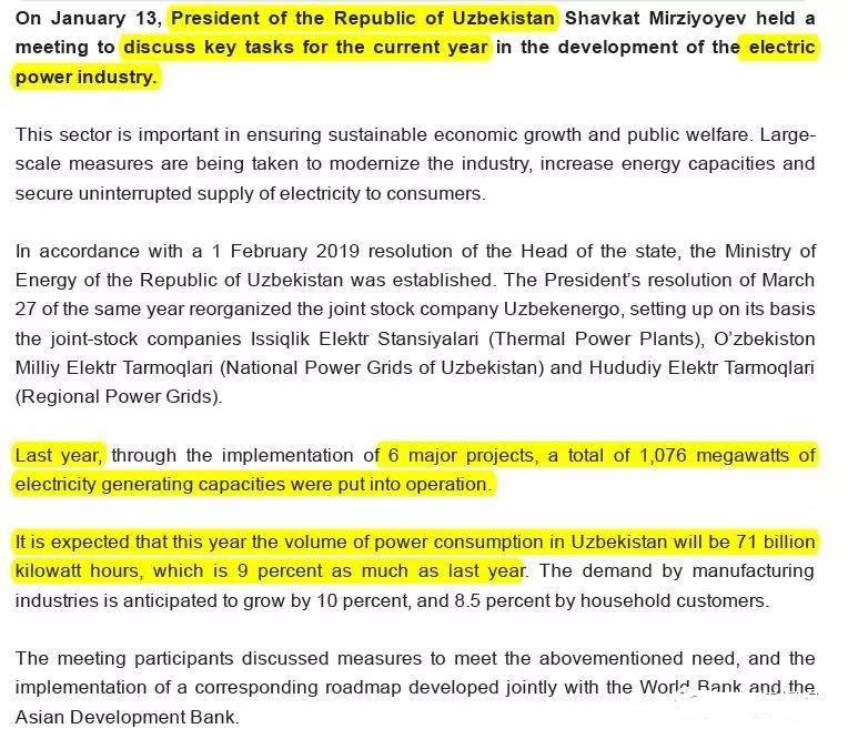 乌兹别克今年重点电力项目列举:400MW光伏\400MW风电\1.1GW热电\120MW水电