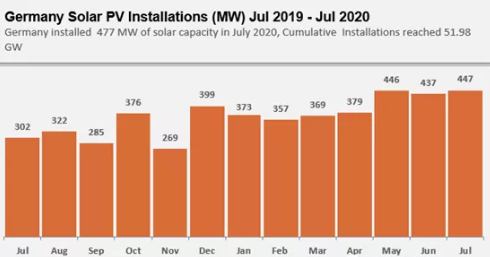 根据德国联邦网络机构Bundesnetzagentur公布的最新数据,德国在2020年7月安装了447兆瓦太阳能容量,比2020年6月增加了11兆瓦(增长2.2%)。去年同月,德国安装了302兆瓦。
