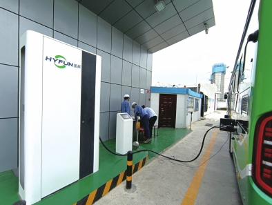 郑州氢燃料电池公交车正在补充能源