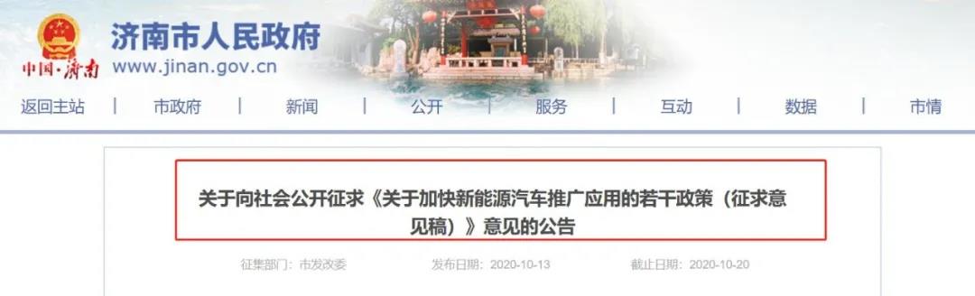 10月13日,济南市发改委发布关于向社会公开征求《关于加快新能源汽车推广应用的若干政策(征求意见稿)》意见的公告。