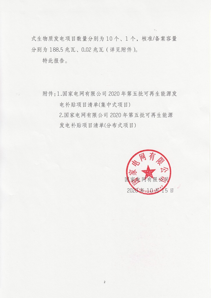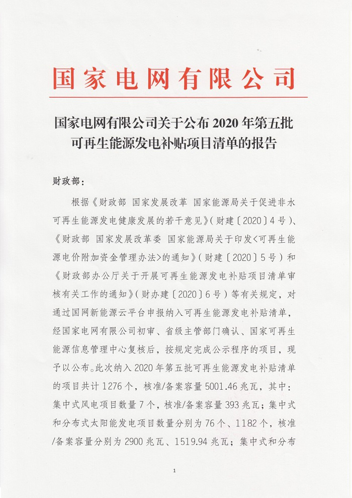 国家电网今日(19日)发布关于公布2020年第五批可再生能源发电补贴项目清单的公告。