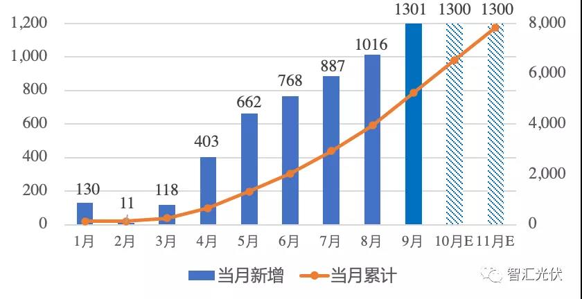 2020年8月,当月全国新增1015.99MW,再创单月新增记录,而9月再打破8月的记录,达到1301MW;
