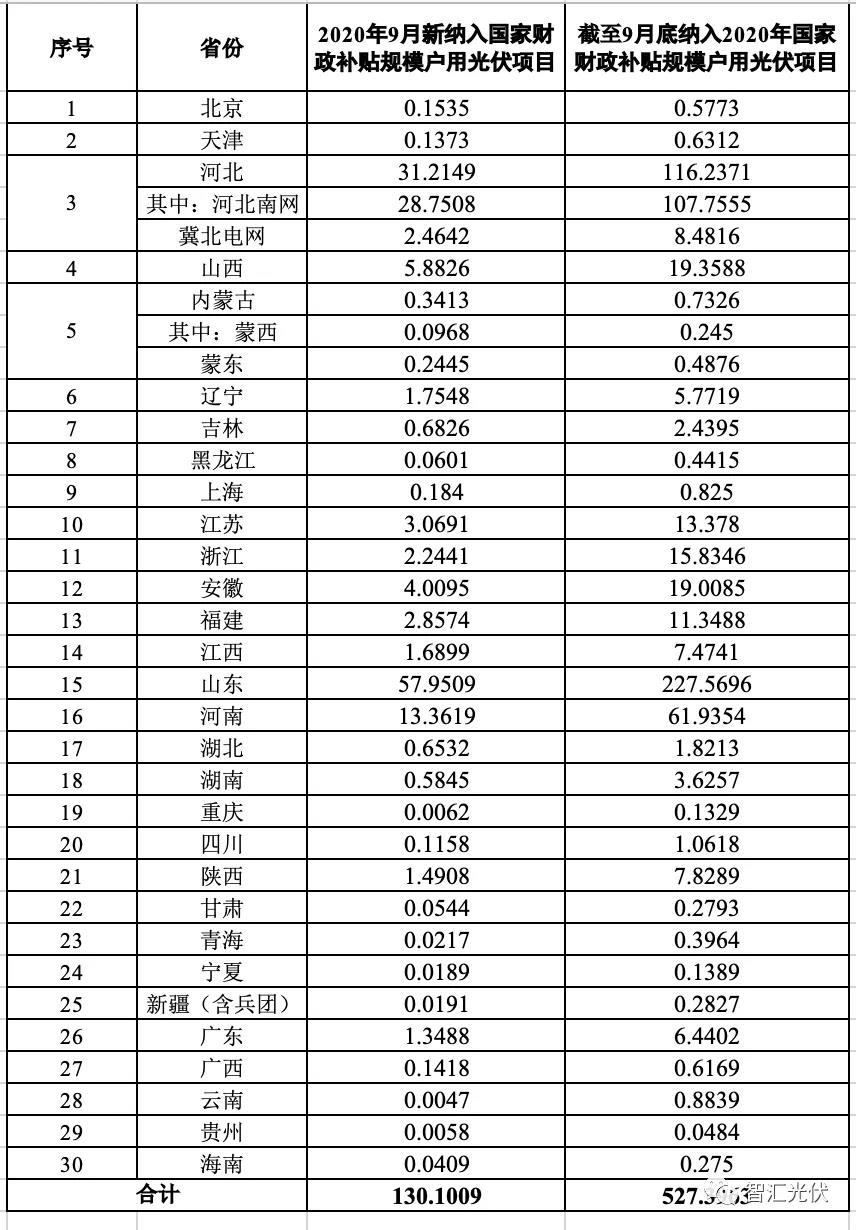 根据各省级能源主管部门、电网企业报送信息,经国家可再生能源信息管理中心梳理统计,2020年9月新纳入国家财政补贴规模户用光伏项目总装机容量为130.1万千瓦。截至2020年9月底,全国累计纳入2020年国家财政补贴规模户用光伏项目装机容量为527.4万千瓦。详细情况见附表。