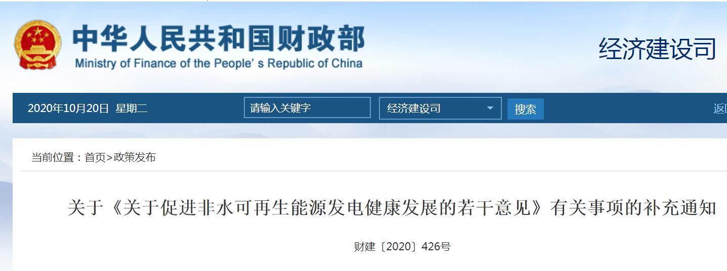 财政部官网消息:刚刚,财政部、 发展改革委、 国家能源局联合发布关于《关于促进非水可再生能源发电健康发展的若干意见》有关事项的补充通知,明确了可再生能源电价附加补助资金(以下简称补贴资金)结算规则,稳定行业预期。
