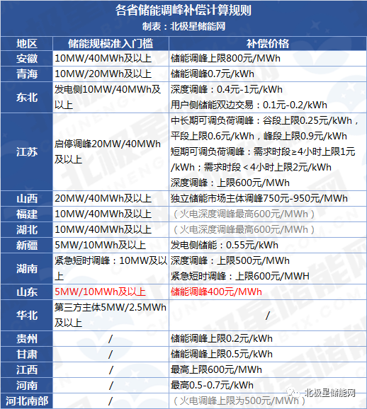 据北极星储能网统计,目前已有近20个省份地区发布有关调峰辅助服务补偿规则文件,其中16省份地区储能调峰补偿整理如下: