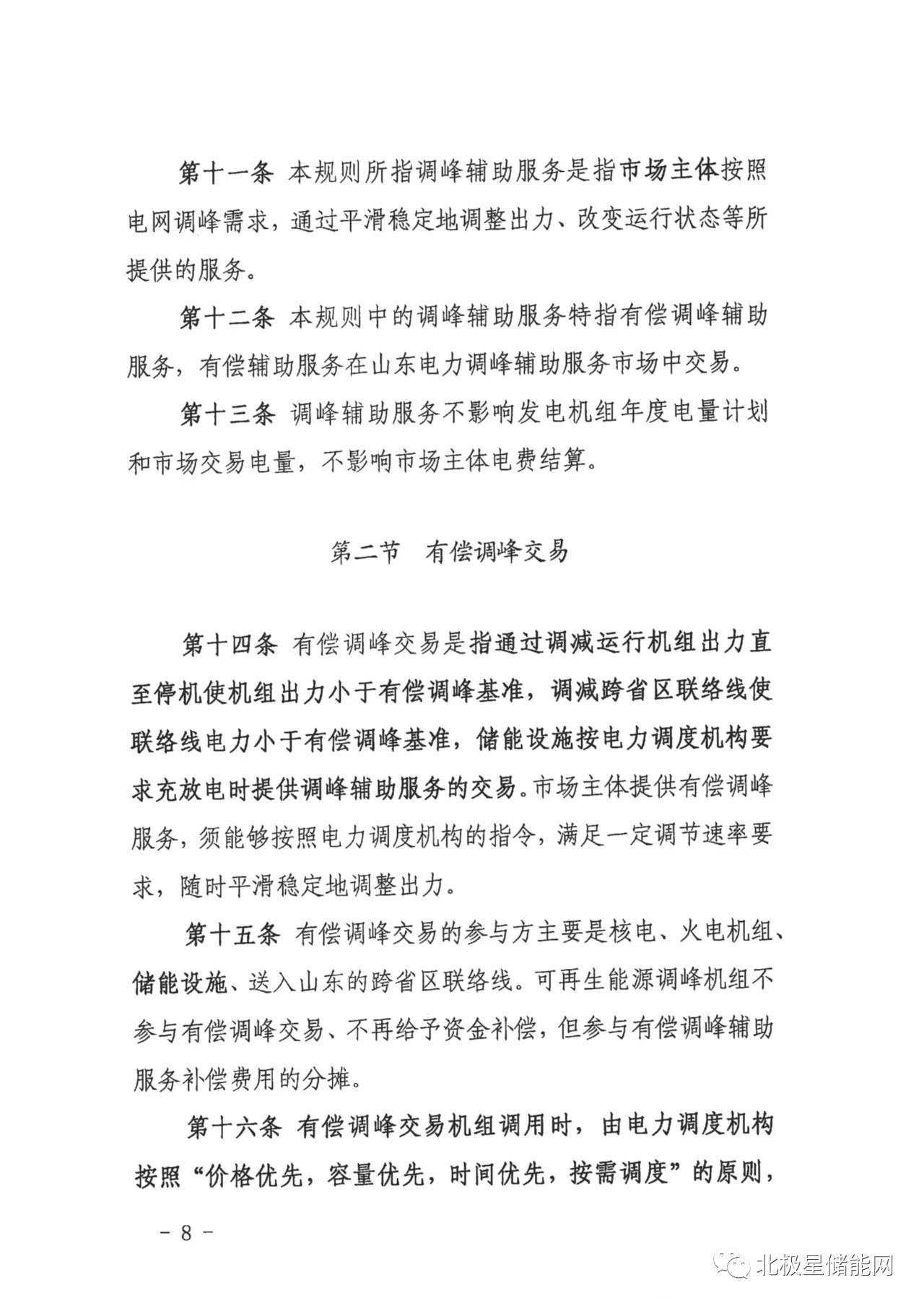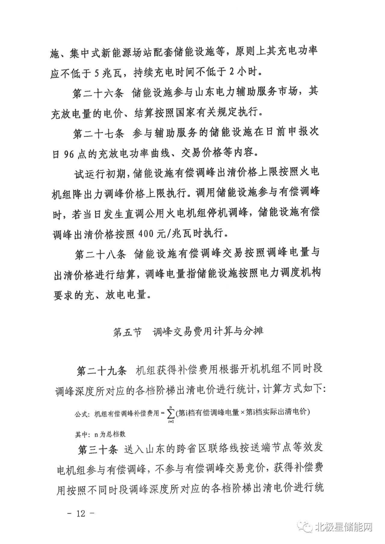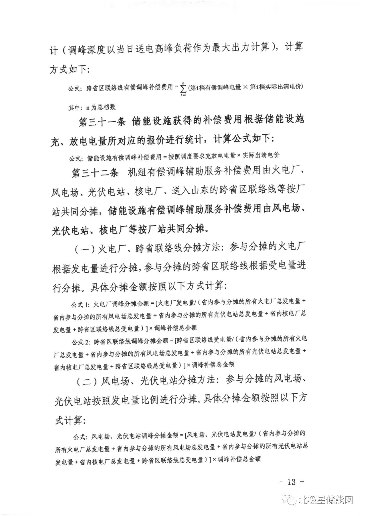 储能设施参与山东电力辅助服务市场,其充放电量的电价、结算按照国家有关规定执行。调用储能设施参与有偿调峰时,若当日发生直调公用火电机组停机调峰,储能设施有偿调峰出清价格按照400元/MWh执行。储能设施有偿调峰辅助服务补偿费用由风电场、光伏电站、核电厂等按场站共同分摊。有偿调峰交易机组调用时,火电机组因参与调峰出力运行至50%及以下时,优先调用储能设施。